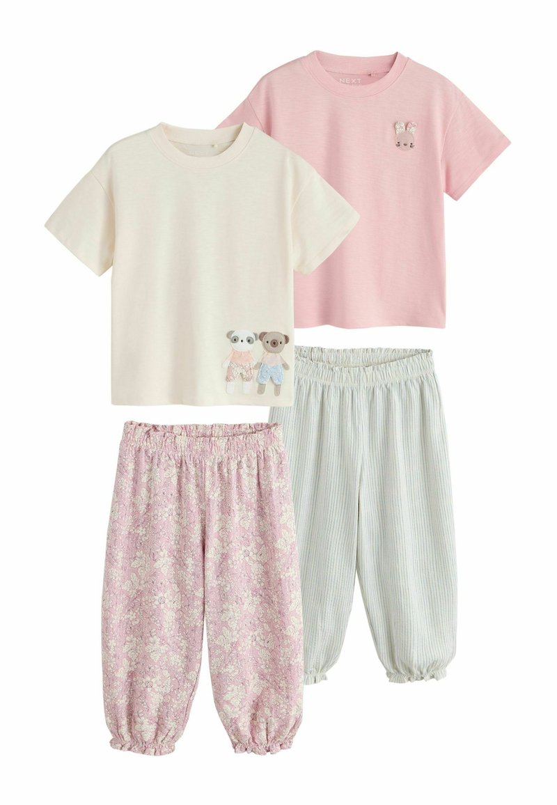 Deux hauts pour enfants à manches courtes, blancs avec applications d'ours et roses avec application de lapin, associés à des pantalons roses fleuris et gris clair rayés à taille élastique.