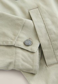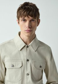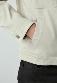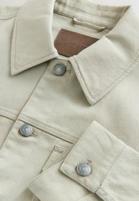 Veste en jean beige à coupe décontractée, col pointu et poignets boutonnés. Comprend un empiècement au dos et des pattes latérales réglables. Jean noir visible en dessous.