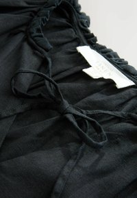 Robe noire sans manches à étages avec encolure à volants et fermeture à nouer devant, fabriquée en tissu de lin léger.