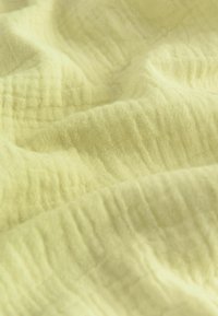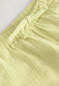 Pantalon en tissu texturé jaune pâle à jambes larges, avec une taille élastique et un cordon de serrage noué à l'avant.