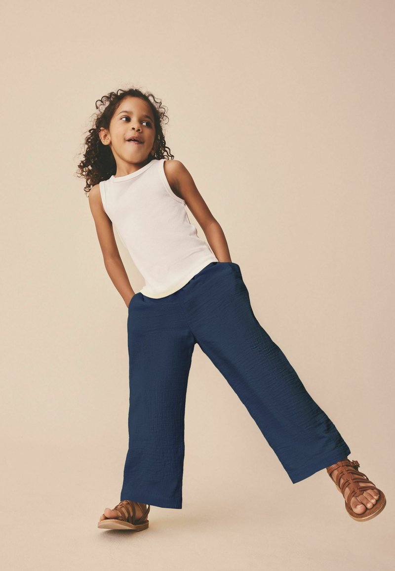 Fille aux cheveux bouclés portant un haut blanc sans manches, un pantalon large bleu marine, et des sandales marron, debout les mains dans les poches et une jambe levée.