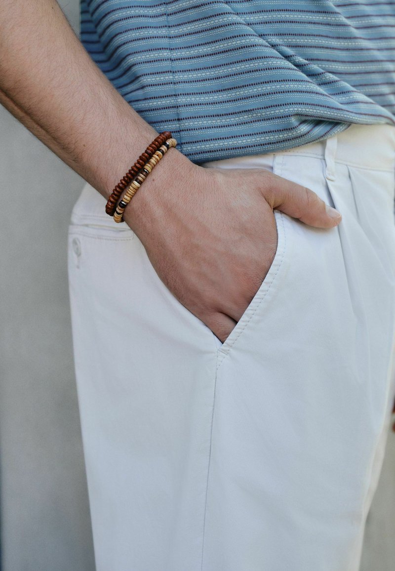 Homme portant une chemise bleue rayée et un pantalon blanc, avec la main dans la poche et des bracelets en perles au poignet sur un fond neutre.