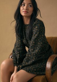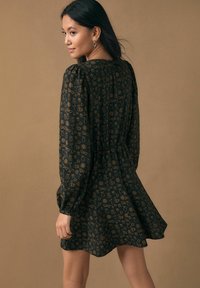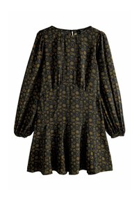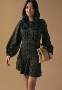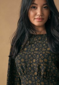 Robe noire à manches longues, poignets froncés et jupe évasée, ornée d'un motif doré de formes et dessins fantaisistes. Fermeture éclair au dos.
