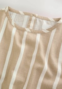 Haut beige à manches courtes avec des rayures blanches verticales et un col rond, présentant un motif de rayures horizontales près de l'ourlet.