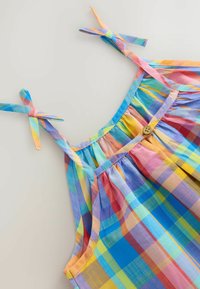 Fille souriante en robe d'été à carreaux colorés, debout près d'une tour de sauvetage blanche sur une plage ensoleillée avec l'océan en arrière-plan.
