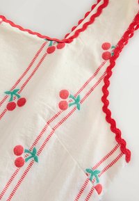 Robe sans manches en coton blanc, avec des bordures festonnées rouges, une fermeture à boutons sur le devant, et un motif répétitif de cerises avec des feuilles vertes le long de lignes verticales.