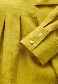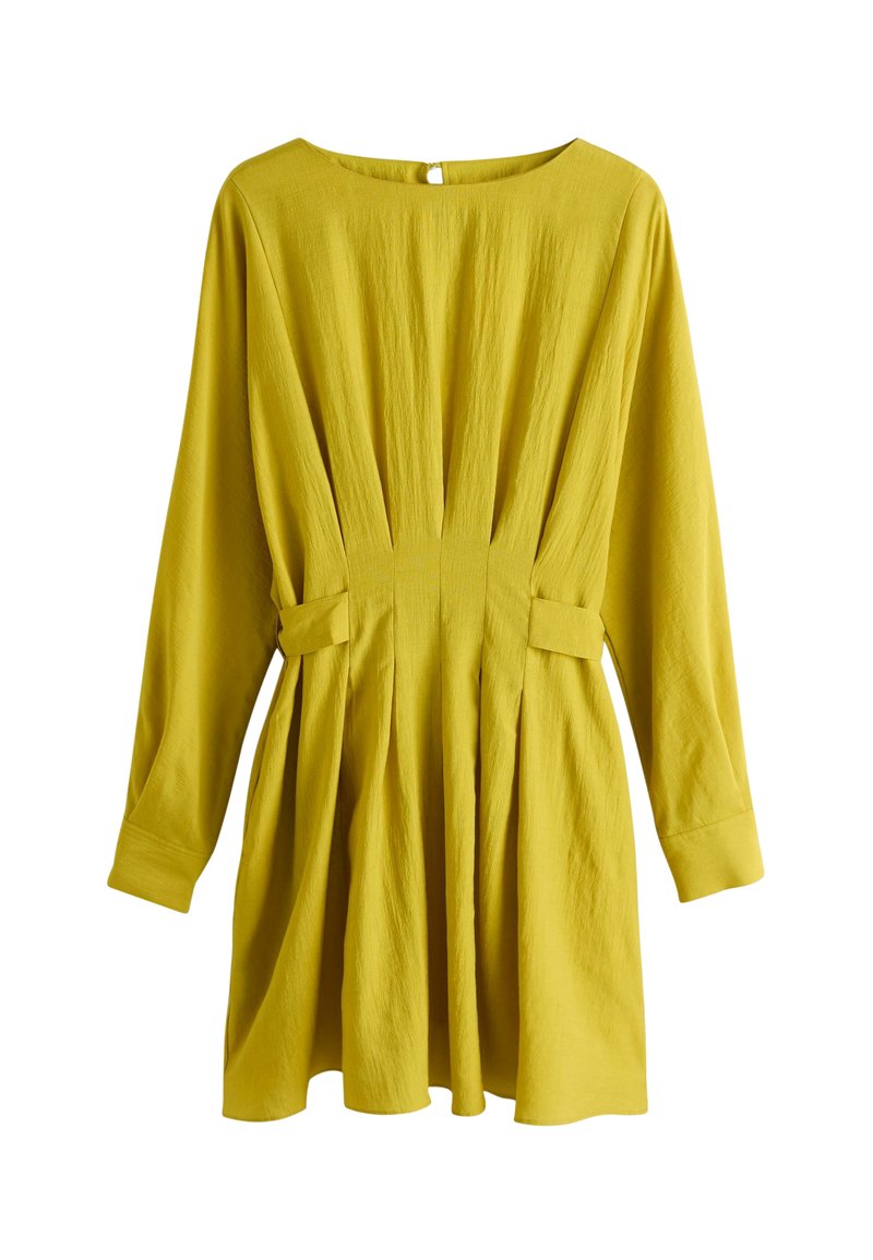 Robe jaune à manches longues avec des détails plissés à la taille et une jupe ample, dotée d'un col rond et d'une fermeture à boutons dans le dos.