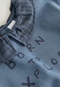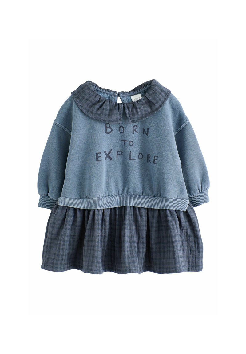 Robe bébé bleu avec col à volants, manches longues, jupe à carreaux et texte « NÉ POUR EXPLORER » sur la poitrine.