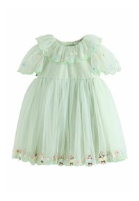 Robe pour tout-petit en tulle à couches couleur crème avec manches bouffantes courtes, bords festonnés, et broderie florale pastel avec sequins.