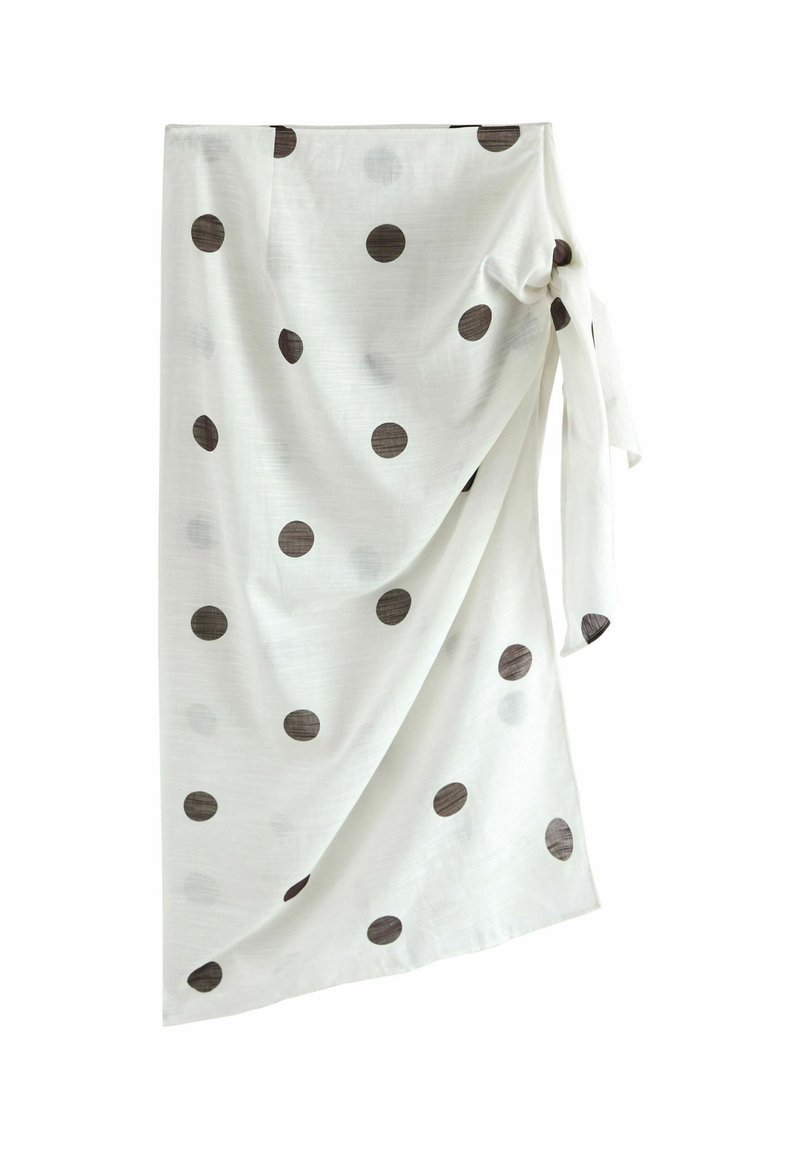 Jupe portefeuille blanche à pois noirs, nouée sur le côté, drapée de plis de tissu doux.