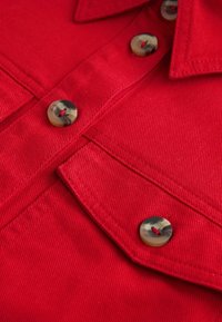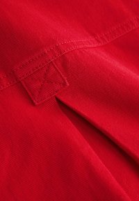 Robe rouge à manches courtes avec col, patte de boutonnage à l'avant et deux poches à rabat sur la poitrine avec boutons, sur fond blanc.