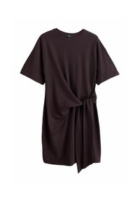 Robe bleue à manches courtes en tissu doux, avec un détail de nœud à l'avant pour un effet froncé. Ourlet droit avec une coupe décontractée.