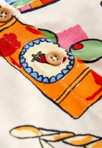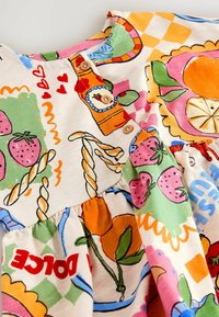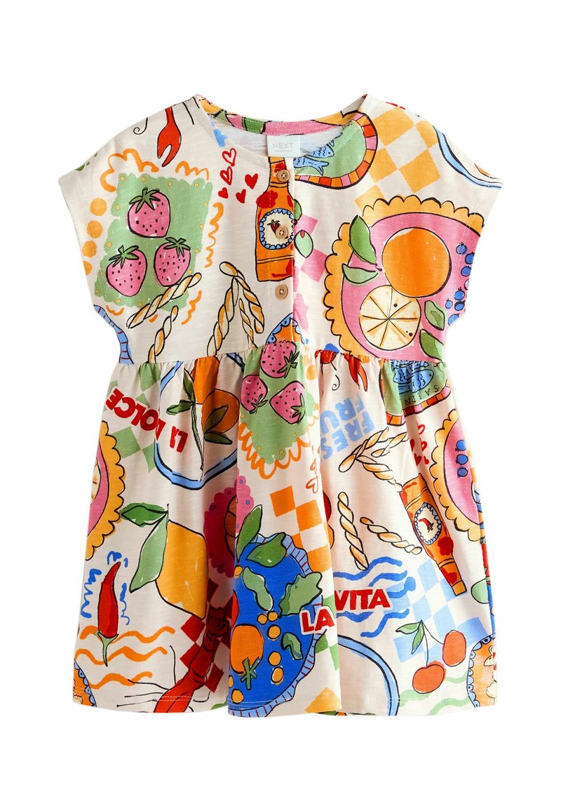 Robe pour tout-petit avec des imprimés colorés de fraises, agrumes, piments, pain et bouteilles, avec le texte « La Vita » et des manches courtes.