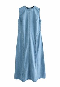 Robe midi en denim bleu clair sans manches, avec encolure ronde et coutures apparentes sur l'avant et les côtés.