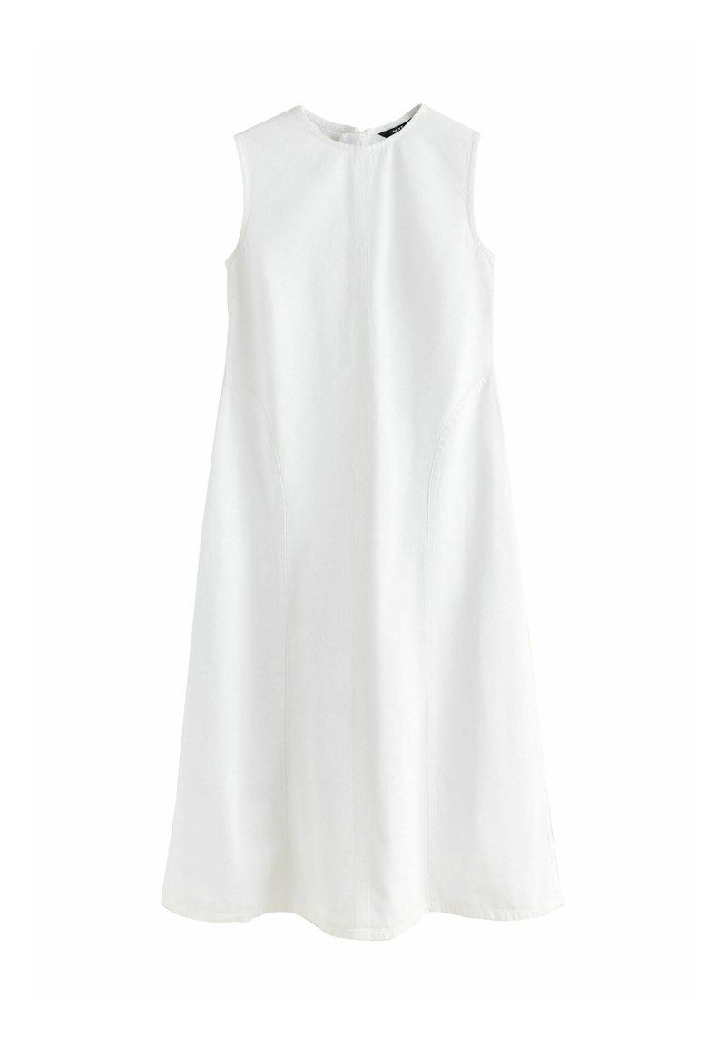 Robe midi blanche sans manches avec un col rond haut et une légère silhouette évasée.