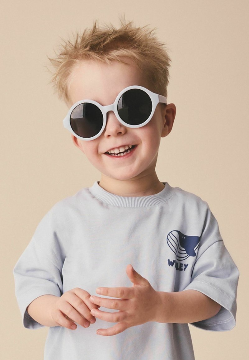 Jeune garçon aux cheveux en piques portant de grandes lunettes de soleil blanches rondes et un t-shirt bleu clair avec un motif de baleine, souriant devant un fond beige.