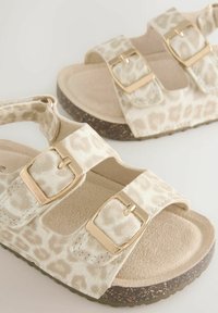 Sandales à imprimé animal beige avec deux boucles dorées réglables, une semelle intérieure rembourrée et une semelle extérieure marron texturée. Design à talon ouvert.