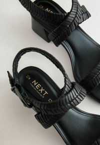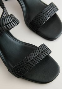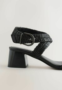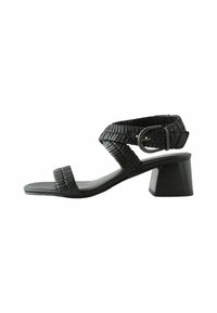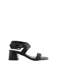 Sandale noire à talon avec des brides texturées, une boucle à la cheville, un bout ouvert et un talon bloc, vue de profil sur fond blanc.