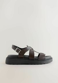 Sandale en cuir marron avec lanières croisées et boucle réglable. Semelle épaisse noire avec motif antidérapant texturé. Conception ouverte à l'arrière pour la respirabilité.