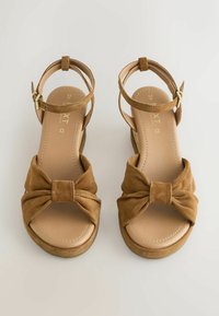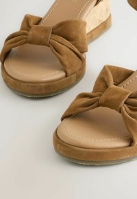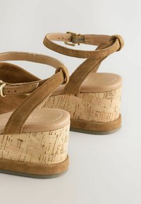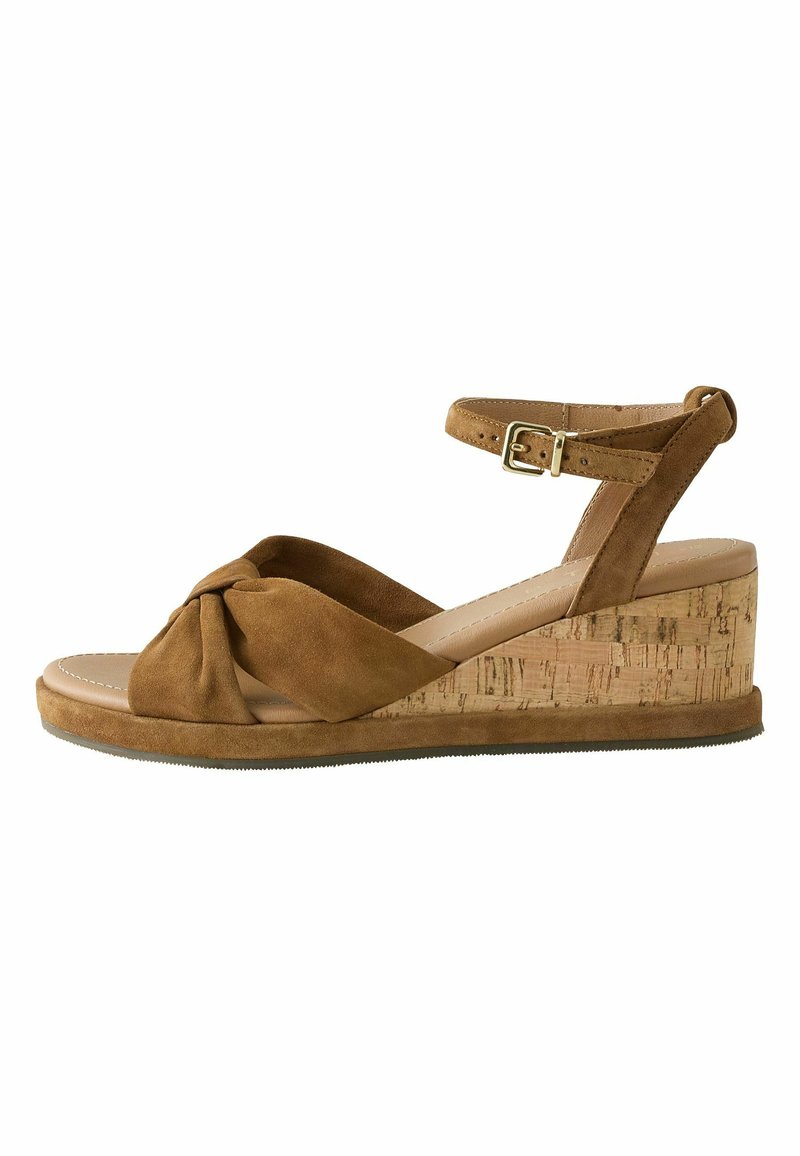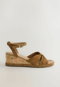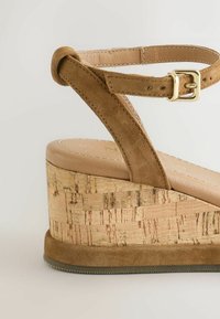 Sandale compensée en daim marron avec talon en liège, bride devant nouée, bride à la cheville et fermeture à boucle dorée.