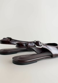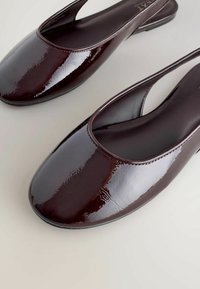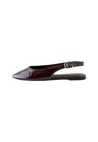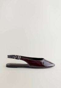 Chaussures plates à bride arrière en cuir verni bordeaux avec bout pointu, boucle réglable et dos ouvert. Semelle plate avec une texture subtile.