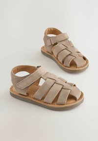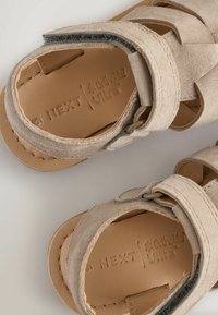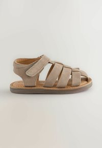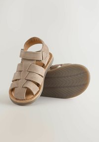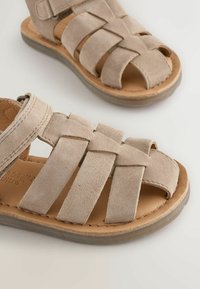 Sandale beige pour tout-petit avec cinq brides en daim et fermeture Velcro réglable à la cheville, semelle plate et semelle intérieure rembourrée.