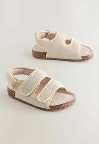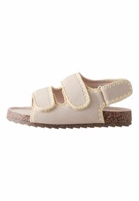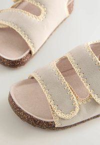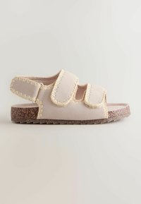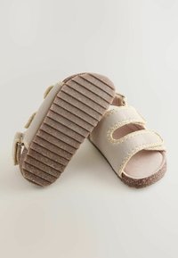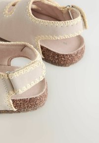 Sandale beige avec semelle en liège, deux brides avant réglables et bride de talon avec détails de coutures apparentes.