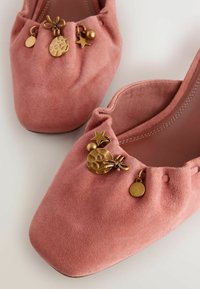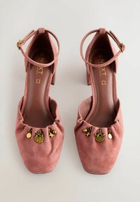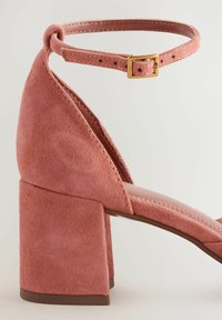 Chaussure femme à talon bloc en daim rose avec bride cheville et bout pointu, dotée d'une petite boucle dorée et de détails froncés à l'avant.