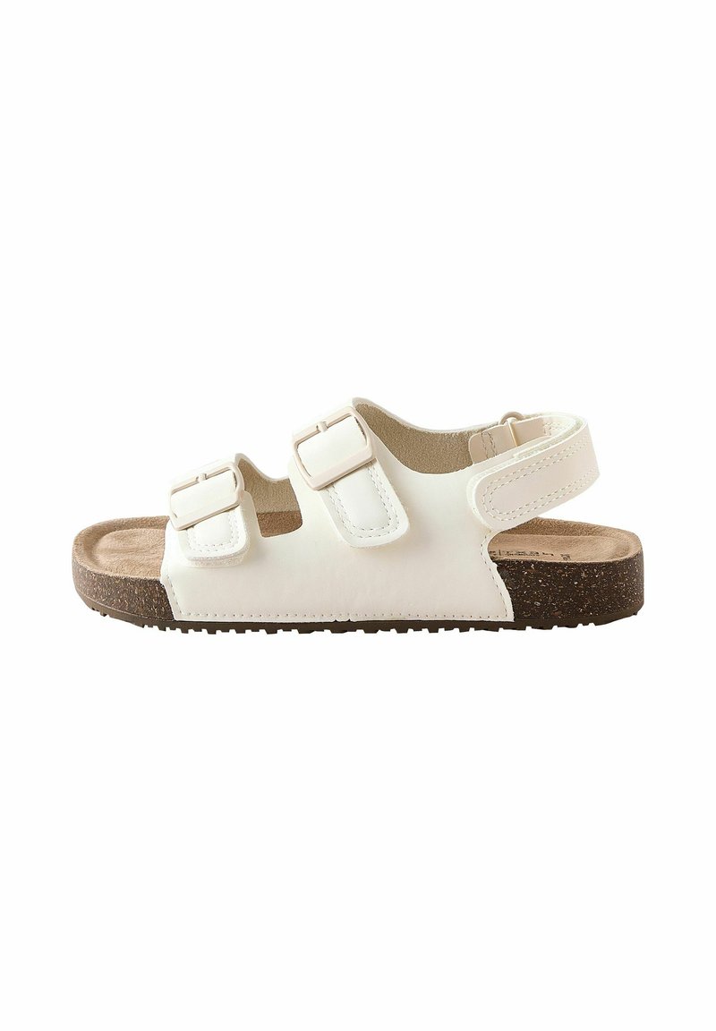 Sandale blanche à bout ouvert avec deux boucles avant ajustables et une bride arrière, dotée d'une semelle en liège et d'une semelle intérieure en daim.
