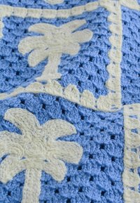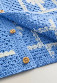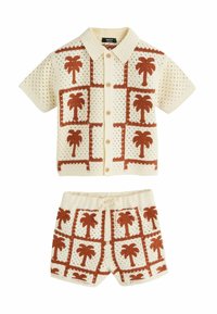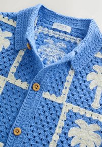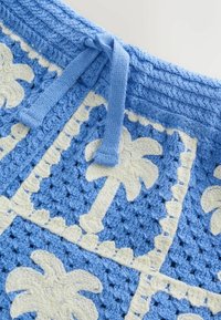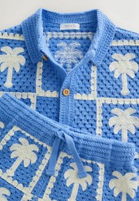 Ensemble de chemise à manches courtes boutonnée et short en crochet bleu avec motifs de palmiers blancs en quadrillage, doté de boutons en bois et d'un cordon de serrage.