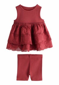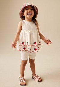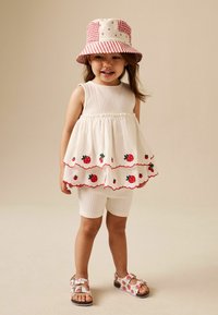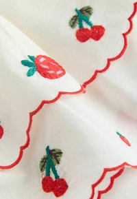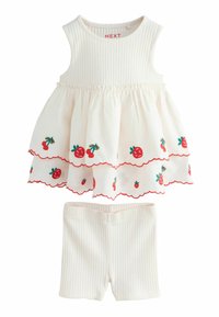 Robe blanche sans manches pour bébé avec cerises et fraises rouges brodées, ourlet festonné, associée à un short blanc côtelé.