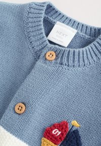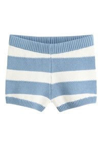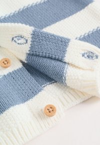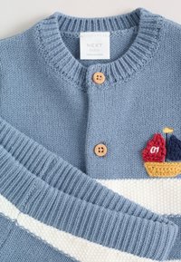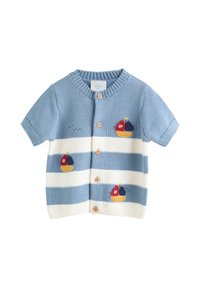 Ensemble tricoté bébé rayé bleu clair et blanc avec boutons, manches courtes, short, et bateaux à voile rouges et bleu marine brodés sur le haut.