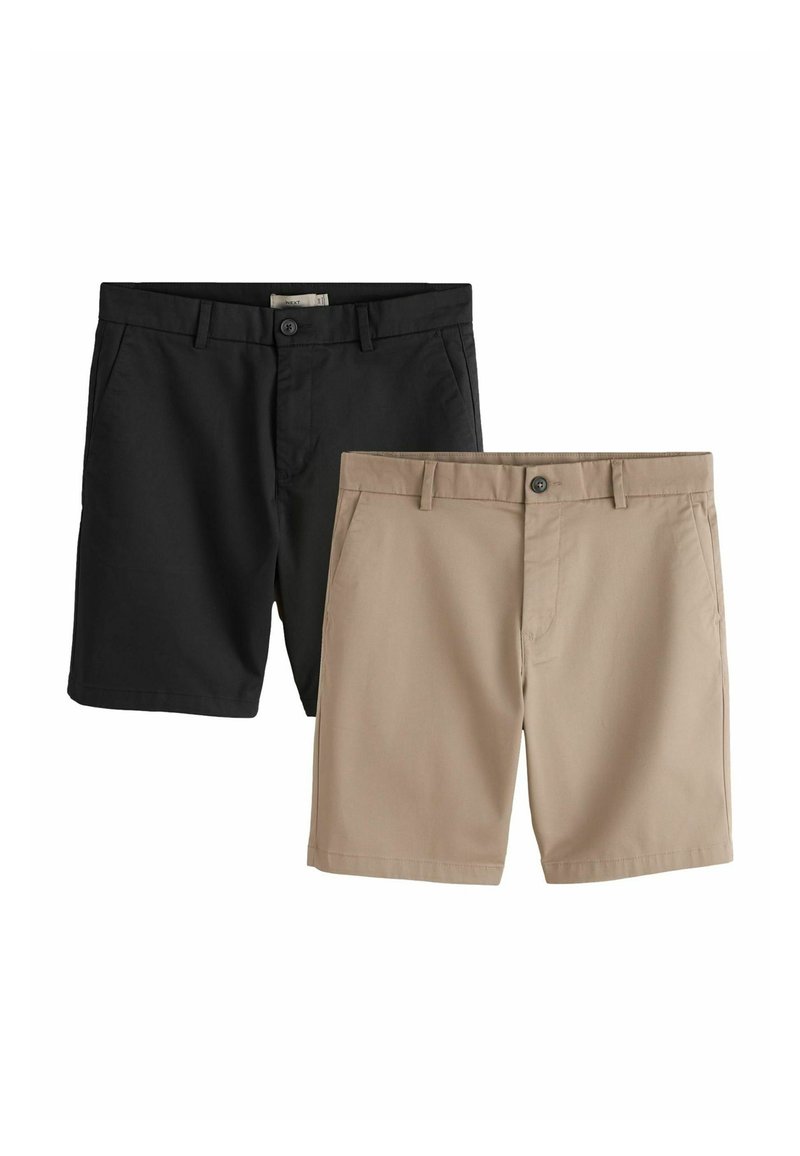 Deux paires de shorts décontractés pour hommes, un noir et un beige, tous deux avec des passants pour ceinture, des boutons à l'avant et des poches latérales.