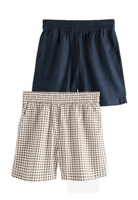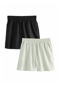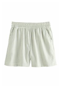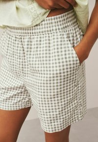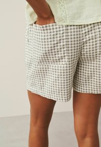 Jeune femme portant un chemisier vert pâle à manches bouffantes avec un ruban rose et un short à carreaux beige, debout les mains dans les poches devant un fond uni.