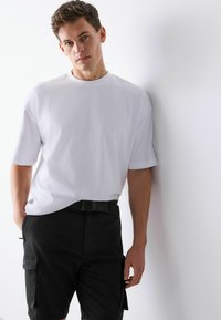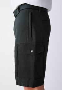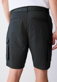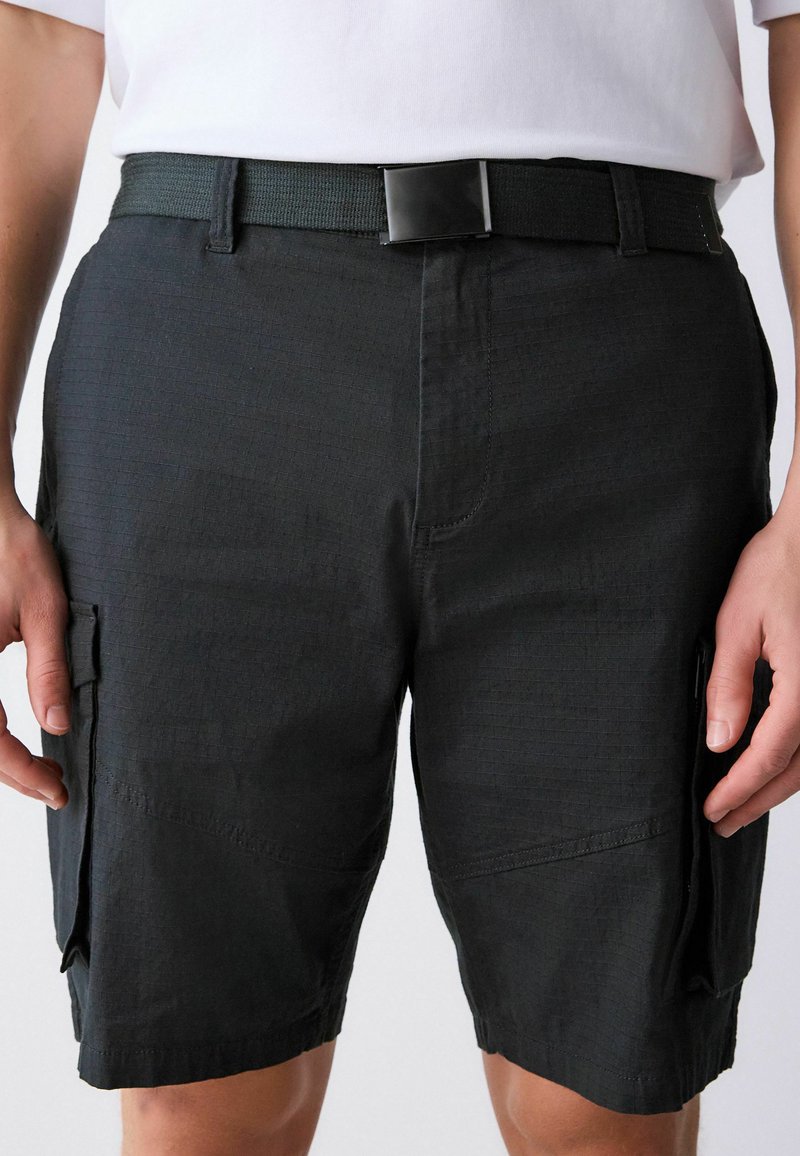Shorts cargo noirs avec poches latérales, portés avec une ceinture en tissu noire et une chemise blanche rentrée, sur une personne debout.