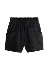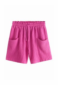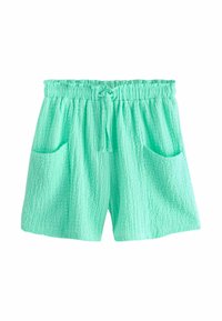 Trois shorts en tissu texturé en noir, vert menthe et rose vif, chacun doté d'une ceinture élastique, d'un cordon de serrage et de poches avant.