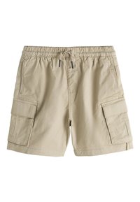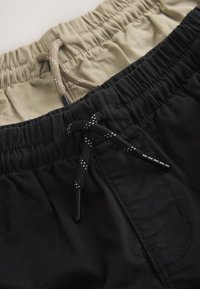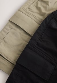 Deux paires de shorts cargo, une noire et une beige, toutes deux avec des ceintures élastiques, des cordons de serrage et des poches latérales, sur un fond blanc.