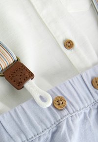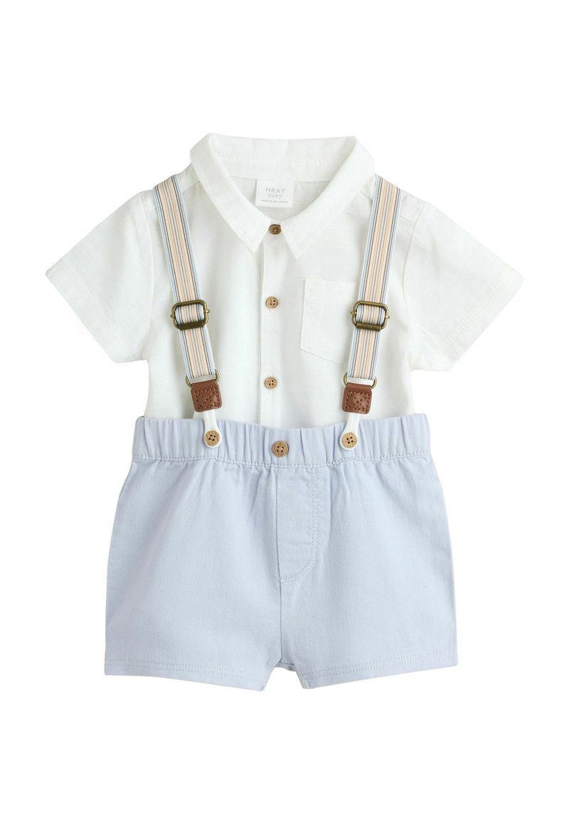 Chemise blanche à manches courtes avec col et boutons marron, short bleu clair et bretelles rayées attachées avec des accents en cuir marron.