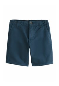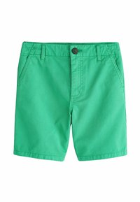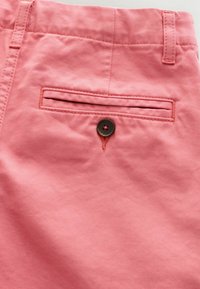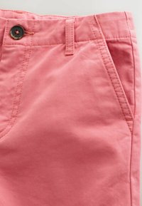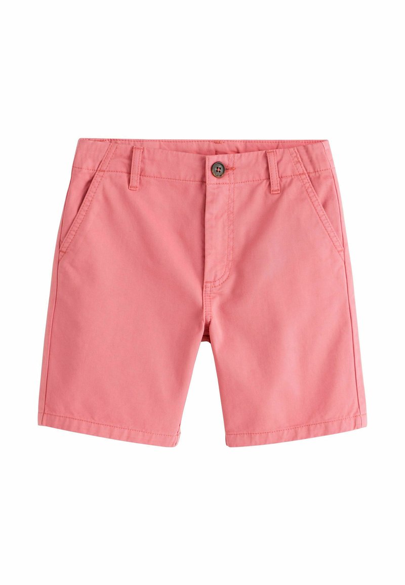 Shorts roses à hauteur des genoux avec passants pour ceinture, bouton à l'avant, fermeture éclair et poches latérales inclinées sur fond blanc.