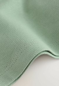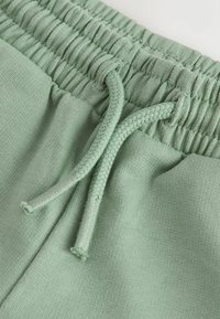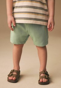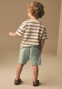 Jeune garçon souriant aux cheveux bouclés portant un t-shirt à manches courtes rayé, un short vert et des sandales marron, debout sur un sol beige.