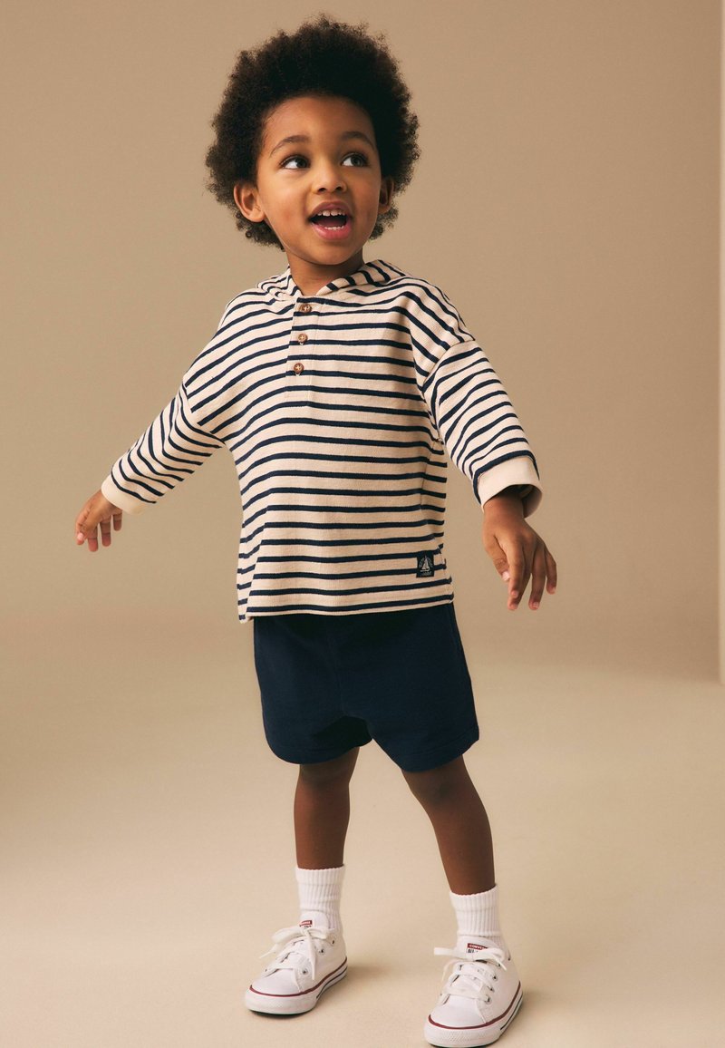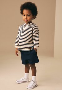 Jeune enfant aux cheveux bouclés portant un t-shirt à manches longues rayé, un short bleu marine, des chaussettes blanches et des baskets blanches, debout les bras écartés.