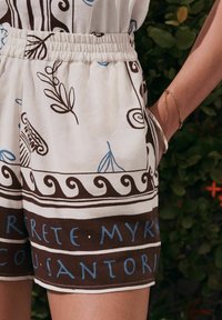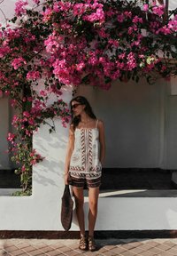 Femme en robe à motifs et sandales se tient sous une bougainvillée rose vif contre un mur blanc, tenant un sac tissé foncé.
