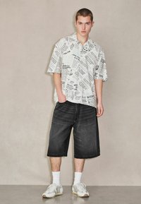 Homme portant un short en jean noir mi-cuisses et une chemise blanche imprimée journaux, debout les mains détendues le long du corps.