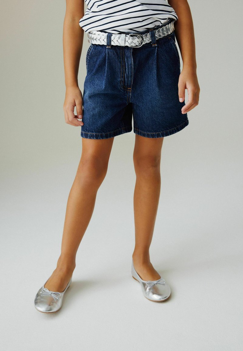 Shorts en jean à coupe décontractée, de couleur bleu foncé, avec des ourlets retroussés. Associés à une ceinture tressée argentée et des ballerines argentées brillantes.