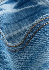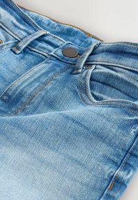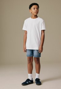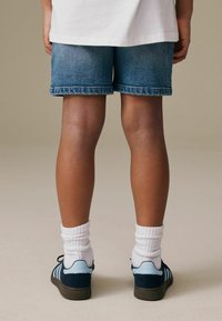 Shorts en jean bleu clair avec une coupe classique, assortis à des baskets bleu marine à rayures blanches et des chaussettes blanches côtelées.