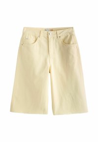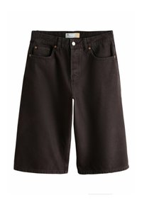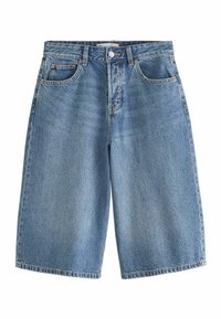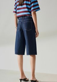 Personne portant un short en denim sombre jusqu'aux genoux, une chemise rayée bleue et bordeaux, une montre au poignet et des sandales à talons noires, debout avec une main dans la poche.