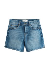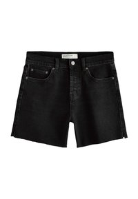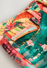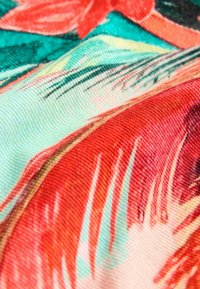Femme portant un short à imprimé floral tropical et un haut de bikini rayé, debout sur une plage rocheuse au coucher du soleil.