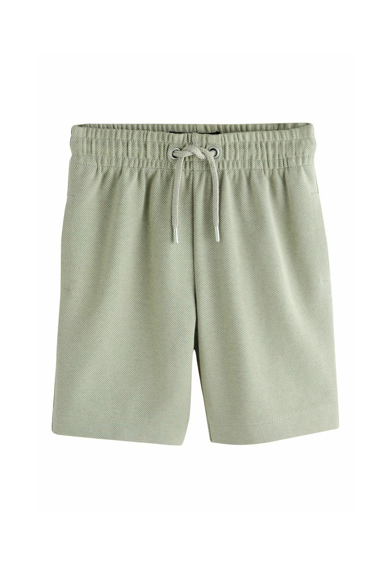 Shorts de bain vert clair en tissu texturé ; dotés d'une ceinture élastique avec cordon de serrage et de poches latérales.