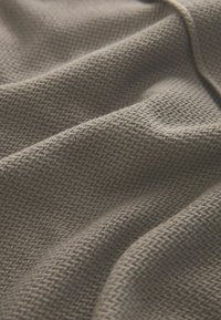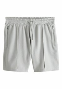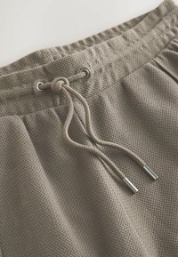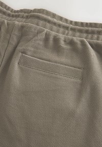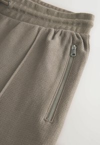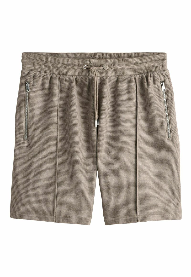 Shorts en tissu beige texturé avec taille élastique, cordon de serrage et poches verticales zippées de chaque côté.
