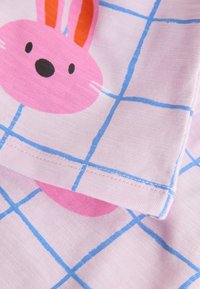Shorts pour enfants rose clair avec motif à carreaux bleus et dessins de visages de chats orange et de lapins roses imprimés partout.